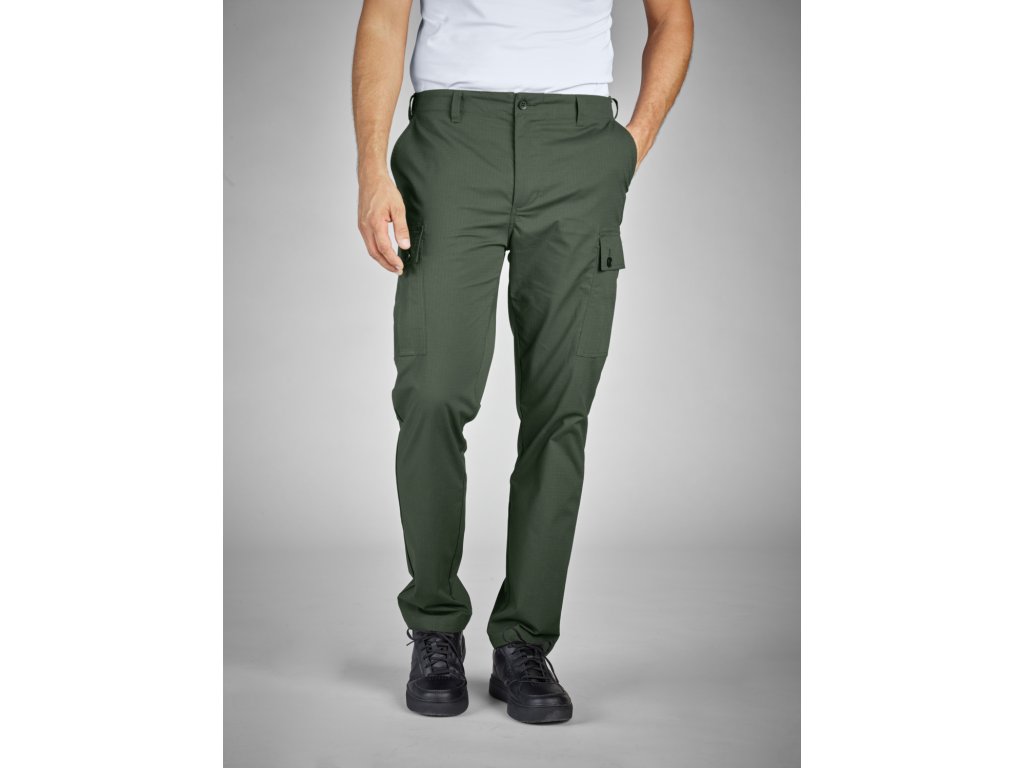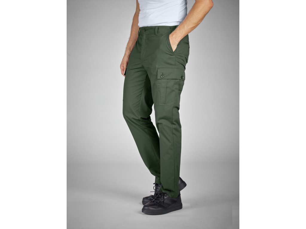 64 % Polyester, 34 % Baumwolle, 2 % Elasthan. 230 g/m². 60°-Wäsche. Sportive Herrenkochhose aus einem funktionalen und leicht elastischen Ripstop-Gewebe. Mit zwei großen aufgesetzten Cargotaschen auf den Beinen und komfortablem Dehnbund im Rückenteil. Zudem mit zwei geknöpften Gesäßtaschen, seitlichen Einschubtaschen und Gürtelschlaufen am Bund. Bequeme Leibhöhe mit leicht schmal zulaufendem Bein. Innenbeinlänge: 80 cm in Gr. 50Dodatočné parametre