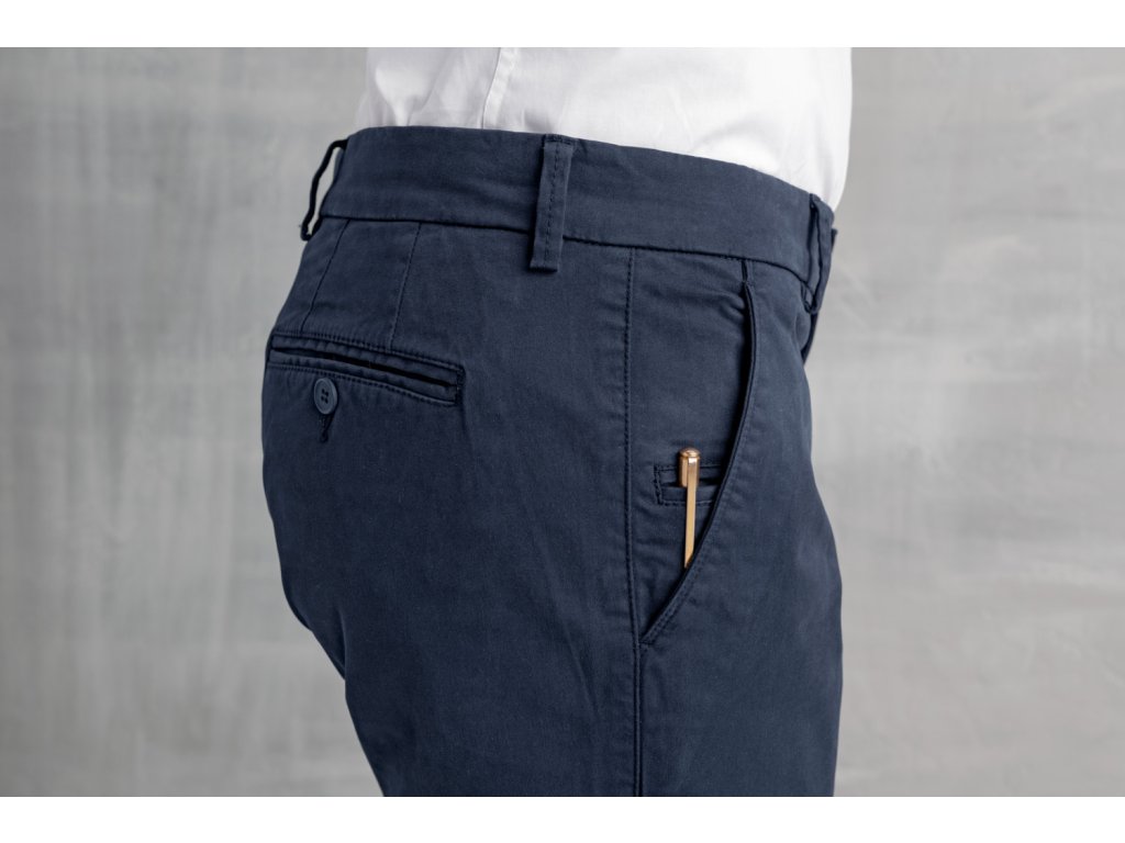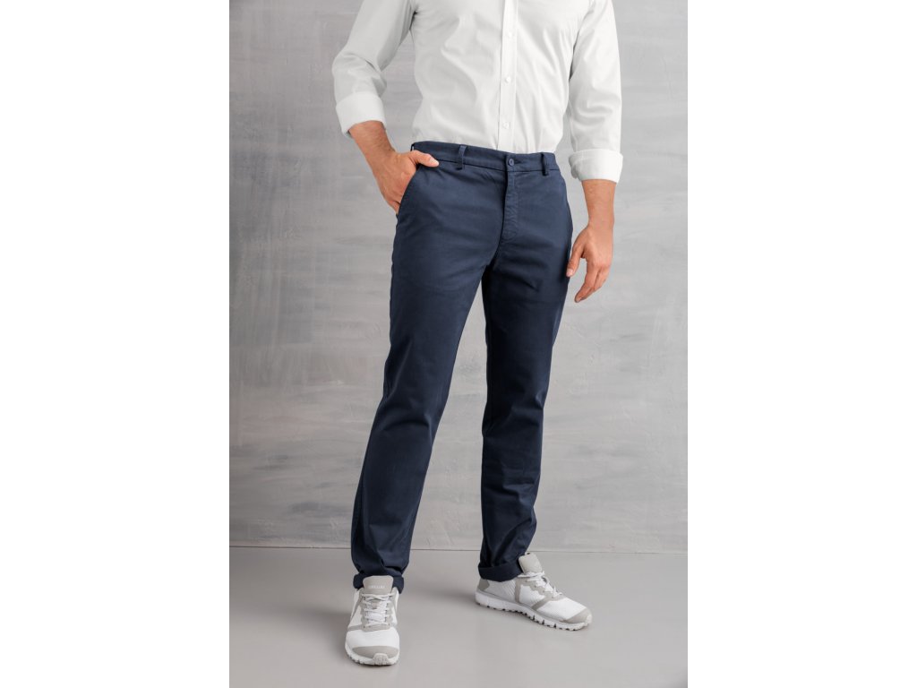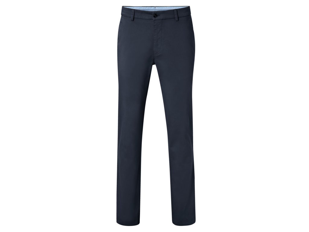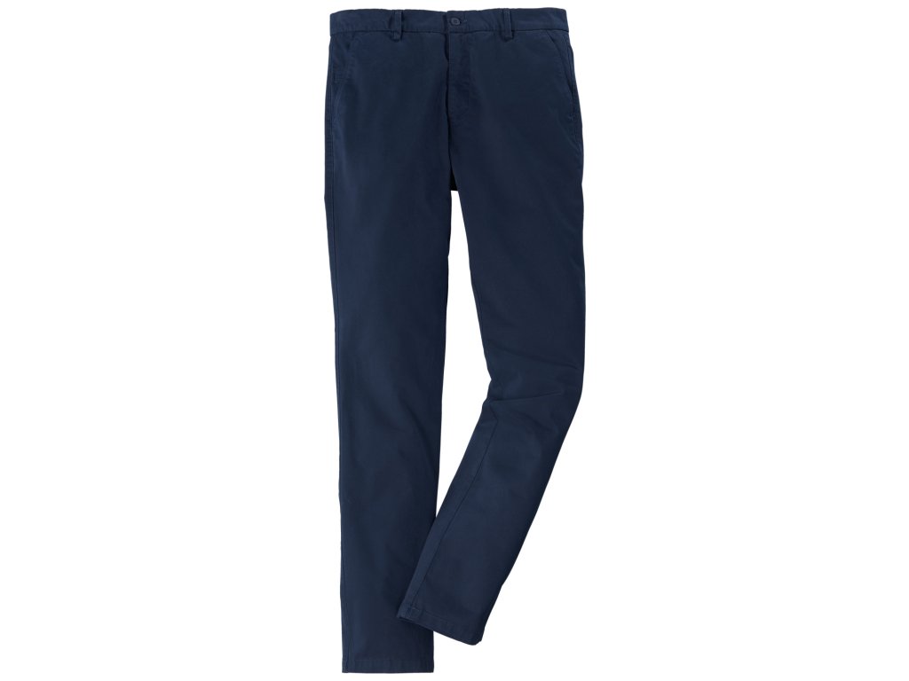 97 % bavlna, 3 % elastan. Jemné pranie na 30°. Ležérne pánske nohavice v štýle chino z mäkkého elastického materiálu. S bočnými prestrihovanými vreckami vrátane integrovaného vrecka na pero na pravej strane. Dve lemované vrecká na gombíky na zadnej strane. Na páse sú pútka na opasok. Elastický pásik na vnútornej strane zabraňuje vykĺznutiu košele. Pohodlný strih s úzkymi rovnými nohavicami. Vnútorná dĺžka nohavíc: 84,5 cm vo veľkosti 50Dodatočné parametre