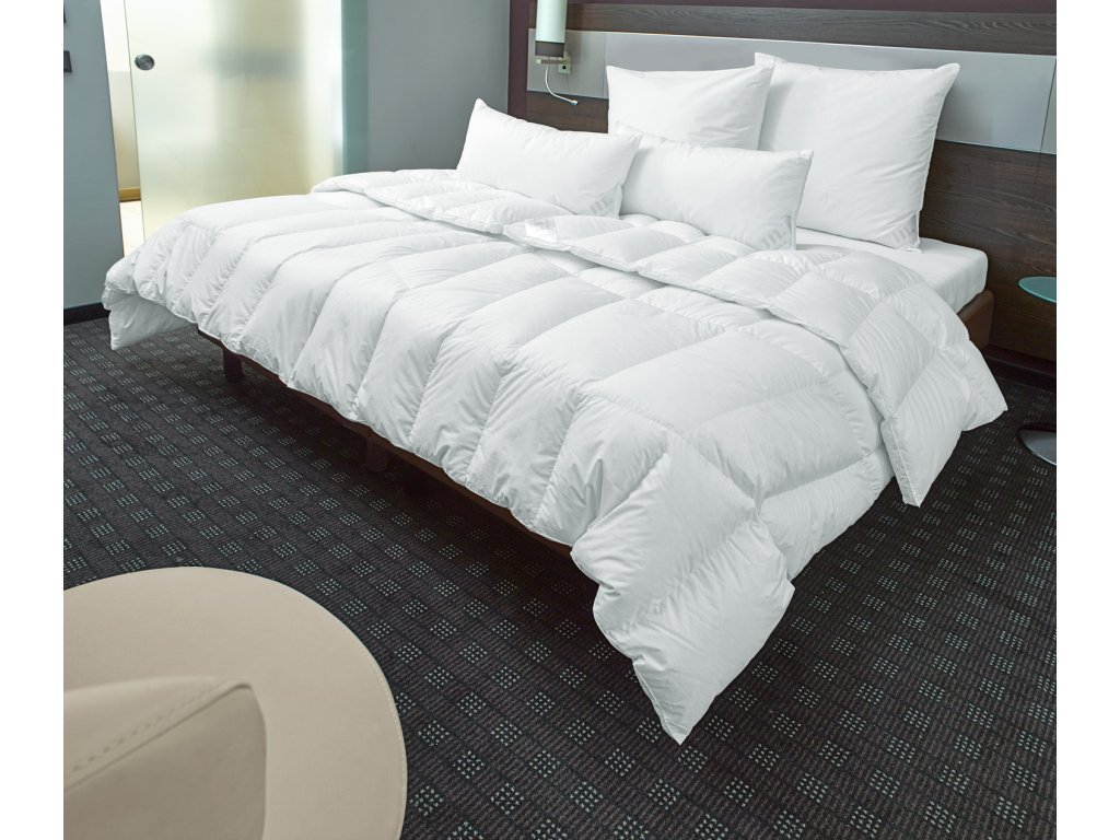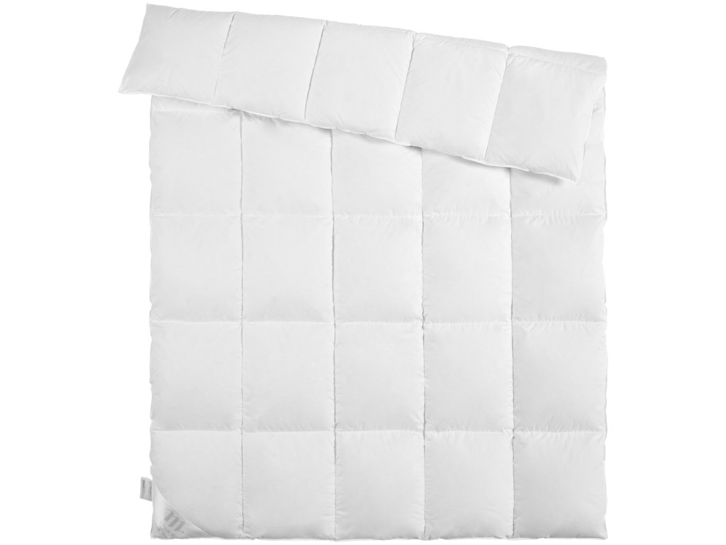 Výplň: 100 % nové biele husacie perie, trieda 1. Poťah: 100 % bavlna, so saténovým lemovaním. Luxusná trieda prikrývky. Žiadne studené mosty - vďaka tvarovému prispôsobeniu prikrývky s 2 cm mostom. Príjemne ľahká výplň s maximálnym vyrovnaním tepla a chladu. Páperie Nomite a obliečka odolná proti roztočom. Vyhovela skúške žeravosti cigariet v súlade s normou EN ISO 12952-1.Dodatočné parametre