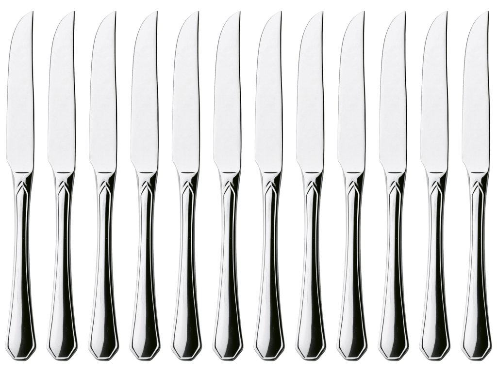 Nerezová oceľ 13/0, odolná proti korózii. Klasický nôž na pizzu/steak. Vysoko leštený. Hrúbka materiálu v gastronomickej kvalite 2,2 mm (merané v najhrubšom bode menu vidličky). Vhodný do umývačky riadu.Dodatočné parametre