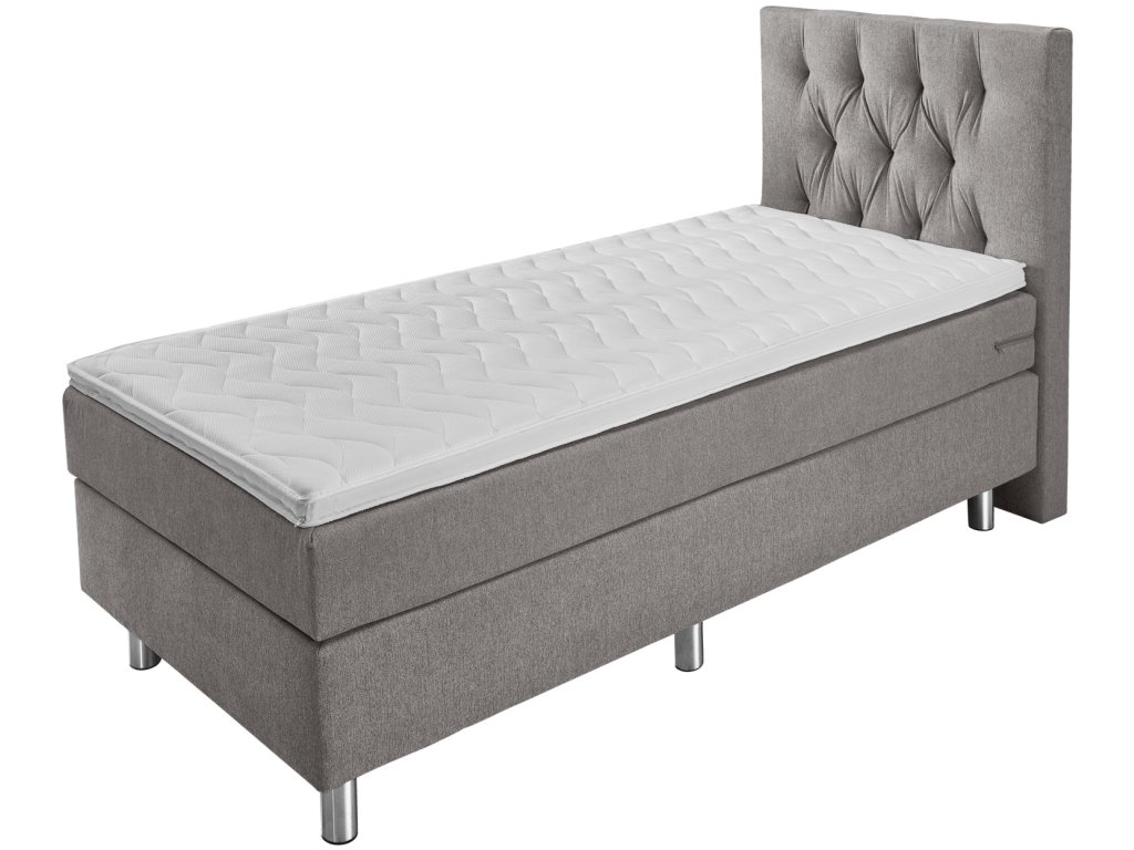 Box spring posteľ v praktickej kompletnej súprave. Box s pružinovým jadrom Bonell. Pružiny Bonell s hrúbkou 2,2 mm. Čalúnený rám. Vrchná časť zo studenej peny pre dobrý komfort spánku. Čelo postele s typickým prešívaním Chesterfield - výška 115 cm. Nehrdzavejúce kovové nožičky v striebornej farbe. Vstupná výška: 63 cm. Výška nožičiek 16 cm + box 20 cm + matrac 21 cm + topper 6 cm spolu: 63 cm. S poťahovou látkou na čalúnenie. K dispozícii ako jednolôžko alebo manželská posteľ. Dodávka vrátane spojovacích prvkov. Nožičky postele sa pri dodaní nachádzajú v krabici.Dodatočné parametre