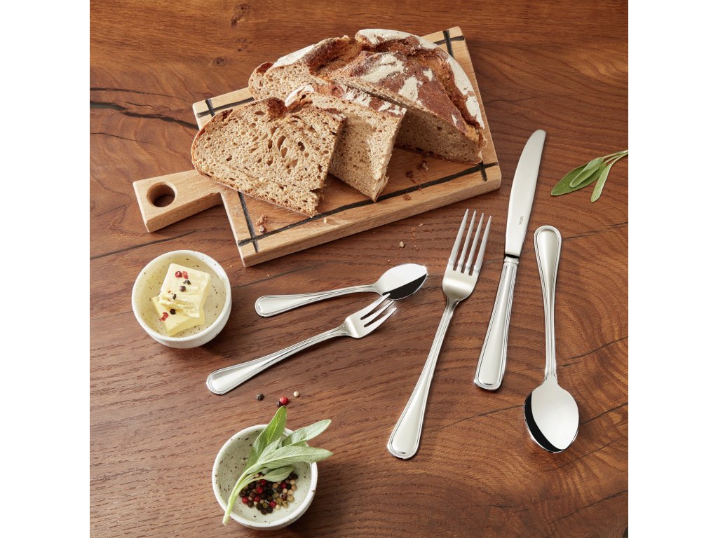 Chróm-niklová nehrdzavejúca oceľ 18/10, odolná proti korózii. Klasická vidlička v známom nadčasovom dizajne. Vysoko leštená. Hrúbka materiálu gastronomickej kvality 3 mm (merané v najhrubšom bode menu vidličky). Vhodná do umývačky riadu.Dodatočné parametre