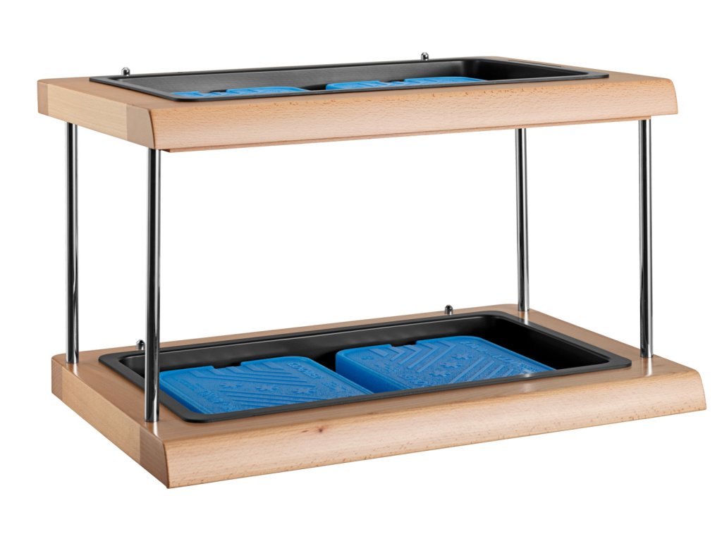 Dvojstupňový prezentačný box z pareného bukového dreva. Pozostáva z na seba uložených masívnych drevených rámov spojených vzperami. K dispozícii v rôznych verziách. Chladiace fľaše a základná vaňa sú súčasťou dodávky. Podnosy a kryt sú k dispozícii samostatne.Dodatočné parametre