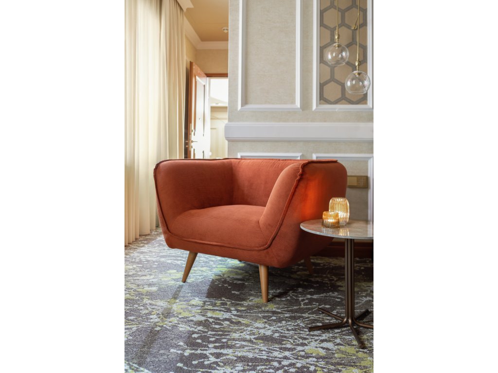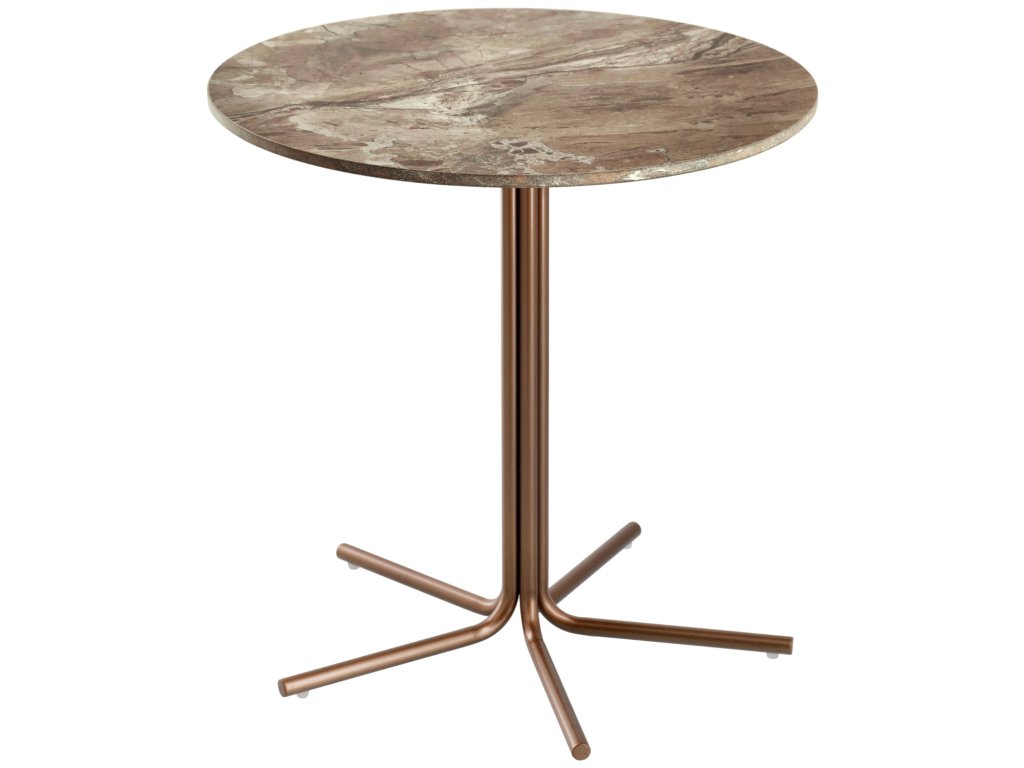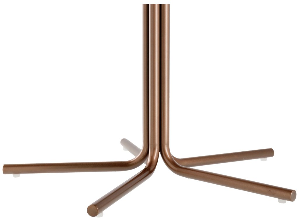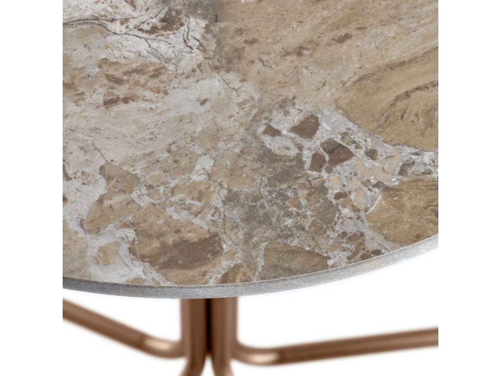 Moderný príručný stolík s pevnou kamennou doskou a podnožou z oceľových rúrok s medenou povrchovou úpravou (odolný proti korózii). Vrchná doska je vyrobená zo spekaného kameňa pre väčšiu kompaktnosť. Rozmery umožňujú flexibilné premiestňovanie, či už v hotelovej izbe, alebo vo vstupnej hale. Dodáva sa zmontovaný, nosnosť do 30 kg. Vhodný len na použitie v interiéri. Na čistenie stolovej dosky používajte čistiace prostriedky s neutrálnym pH, rozliate tekutiny čo najrýchlejšie zotrite mäkkou handričkou a potom vyčistite vlažnou vodou.Dodatočné parametre