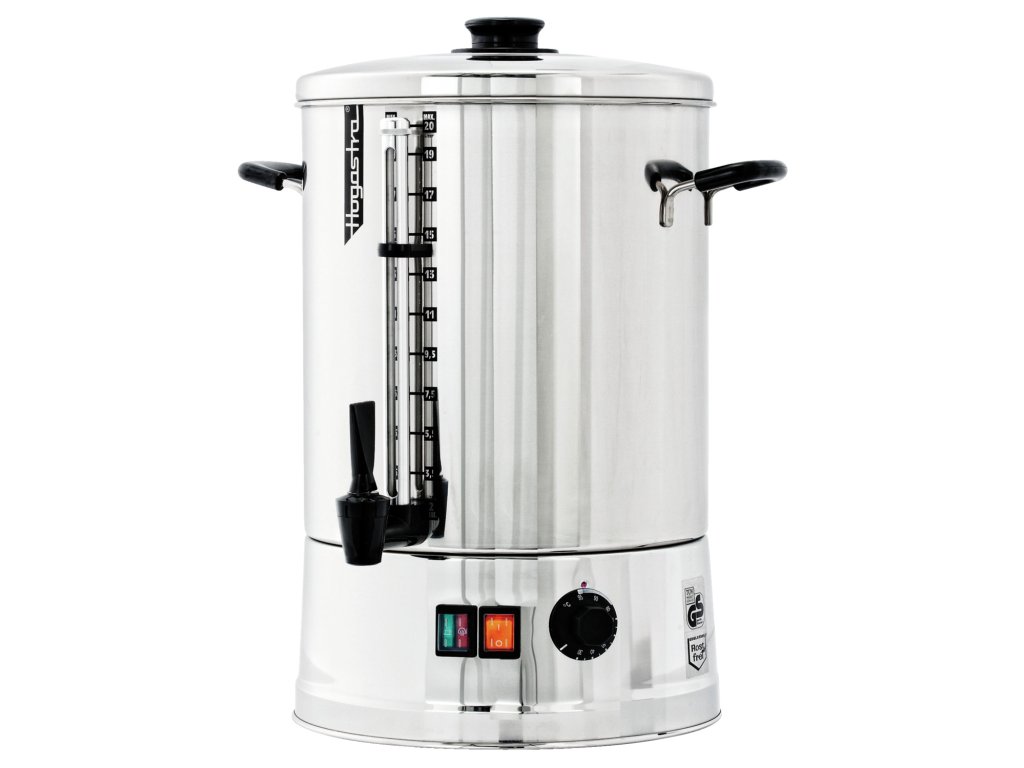 Vysoko výkonný prístroj na prípravu teplej vody z nehrdzavejúcej ocele 18/10. Dokáže zabezpečiť až 15 litrov vody za hodinu. Čas ohrevu približne 20 minút. Praktický kohútik umožňuje rýchle plnenie šálok alebo džbánov. Ryska ukazuje množstvo zostávajúcej vody. Príkon: 2000 W, objem 2 - 20 litrov, podsvietený vypínač, kontrolka: fáza ohrevu červená alebo fáza udržiavania zelená. S ručne nastaviteľnou reguláciou teploty, vykurovanie z nehrdzavejúcej ocele pre teploty od 30 °C do 95 °C.Dodatočné parametre