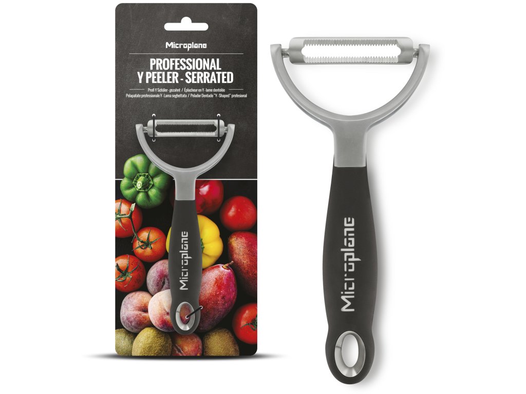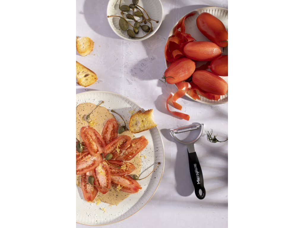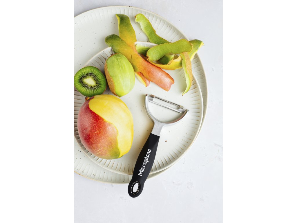 Profesionálna škrabka v tvare písmena Y. Optimálna manipulácia. Ergonomická, protišmyková rukoväť s mäkkým povrchom, dvojitá čepeľ z nehrdzavejúcej ocele ostrá ako britva, vrúbkovaná pre ľahké a rovnomerné lúpanie. Ideálna na širokú škálu ovocia a zeleniny, najmä tých s mäkkou šupkou, ako sú paradajky, kivi, mango atď.Dodatočné parametre