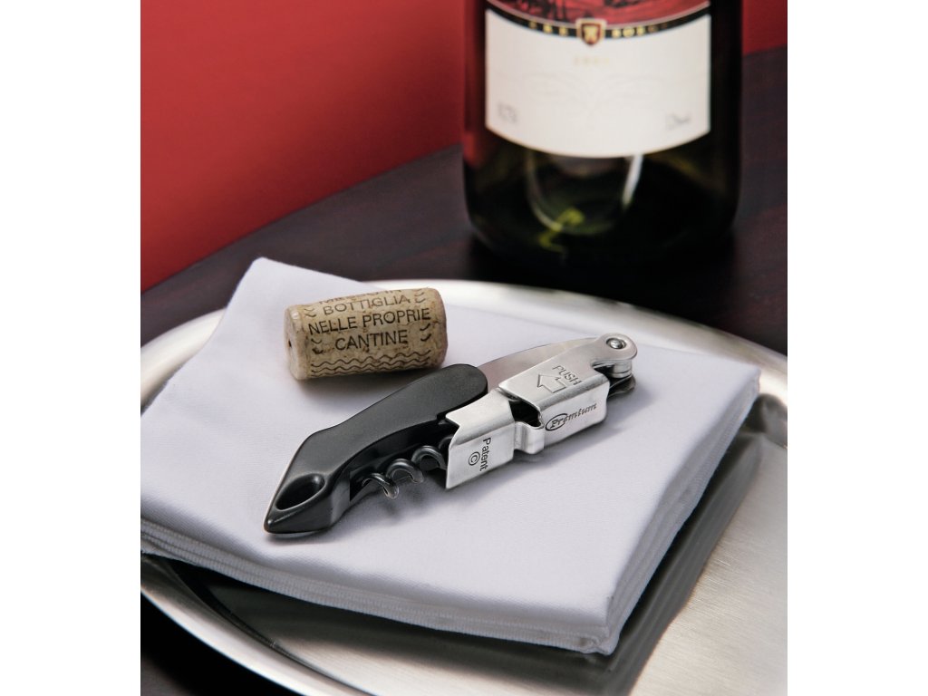 Nerezový, s nerozbitnou čiernou plastovou rúčkou. Vývrtka má teflónový povrch. Otvárak na víno s dvojitou push-funkciou, ktorá umožní bezpečné odkorkovanie s minimom sily. Materiál: oceľ, umelohmotná odolná rúčka.Dodatočné parametre