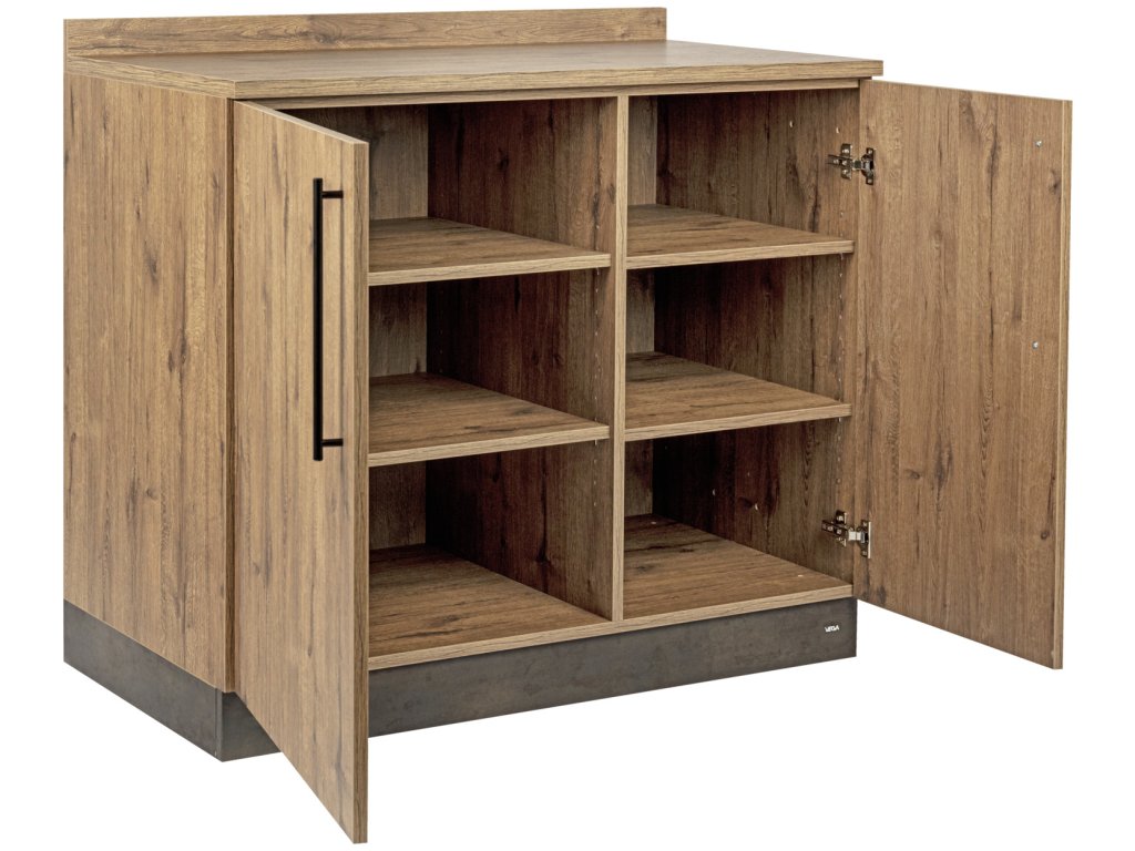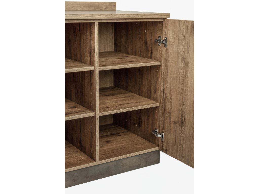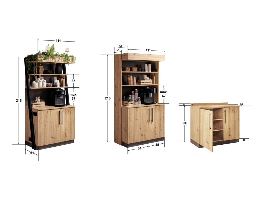 Pult Baristo Basic je ideálny kus nábytku pre reštaurácie, kaviarne, pekárne alebo obchodné priestory, či už ako samoobslužný kávový pult alebo obslužné miesto v každodennom stravovaní. Robustná odkladacia plocha poskytuje priestor pre profesionálne kávovary, pokladničné systémy alebo jedálne lístky a všetko, čo musí byť na dosah. Maximálne zaťaženie pracovnej plochy 80 kg. Systém Baristo Basic pozostáva z panelov na báze dreva. * K dispozícii sú 2 rôzne farebné verzie * 2 výklopné dvierka s vysokokvalitnými pántmi a dve výškovo nastaviteľné police (maximálne zaťaženie 25 kg na jednu policu) * Vyrovnávacie nožičky na podlahu * Zadná strana s dekoratívnym náterom na voľné umiestnenie v miestnosti * Dodáva sa v zmontovanom stave * Vhodné len na použitie v interiériDodatočné parametre