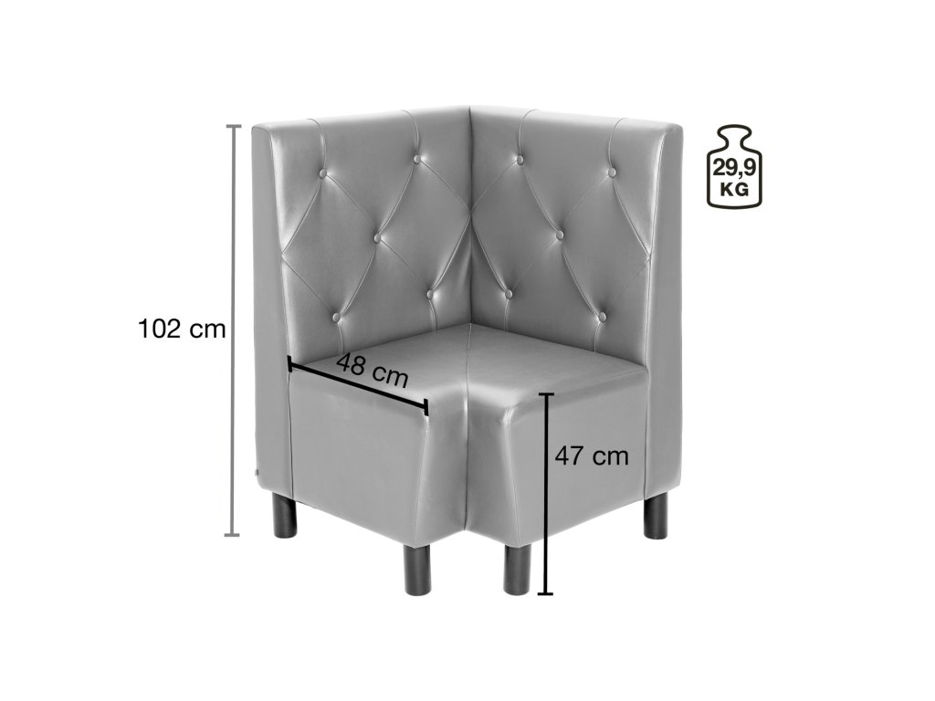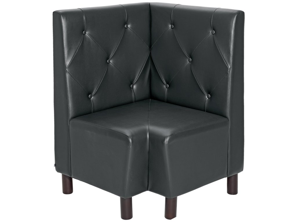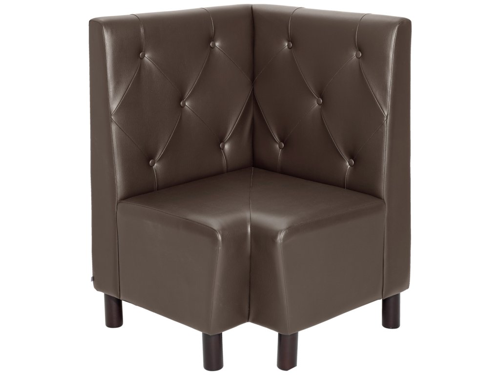 Moderný rohový prvok z masívneho moreného bukového dreva s imitáciou kože. Vysoké operadlo a celočalúnené čalúnenie zabezpečujú príjemný komfort sedenia. Ľahko udržiavateľný poťah odolný proti oderu a ohňovzdorný. Možno prepojiť s ďalšími prvkami pomocou spojovacieho kovania - objednajte si ho prosím samostatne (číslo položky: 10093926). Vhodné len na použitie v interiéri. Dodáva sa čiastočne zmontovaný - stačí priskrutkovať nohy. Zodpovedajúcu 2-miestnu lavicu si objednajte samostatne.Dodatočné parametre
