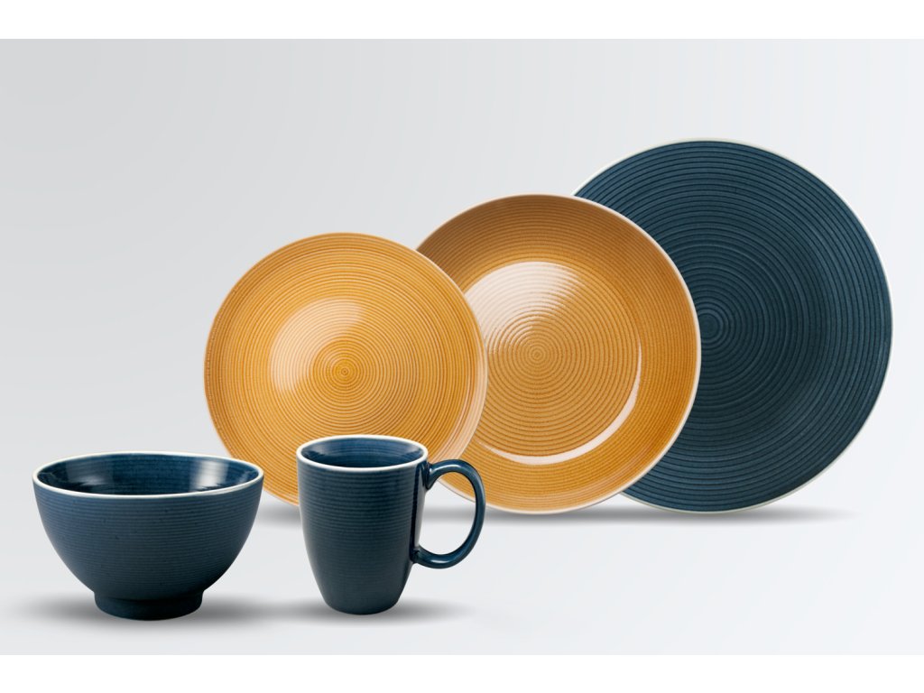 Sada pre štyri osoby pozostáva zo štyroch plytkých tanierov Ø 21cm (hnedé) a Ø 28cm (modré), hlbokých tanierov Ø 24cm (hnedé), misiek ØxV 15,5x9,5cm (modré) a štyroch hrnčekov 0,34 l (modré). Farebná sada z kameniny so špirálovitým vzorom. Možné farebné variácie Vhodné do umývačky riadu a mikrovlnnej rúry.Dodatočné parametre