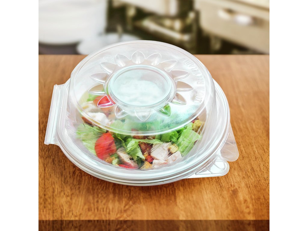 Stohovateľná šalátová misa z recyklovateľného polypropylénu s priehradkou na dressing. S vekom, pre potraviny do 100 ˚C.Dodatočné parametre