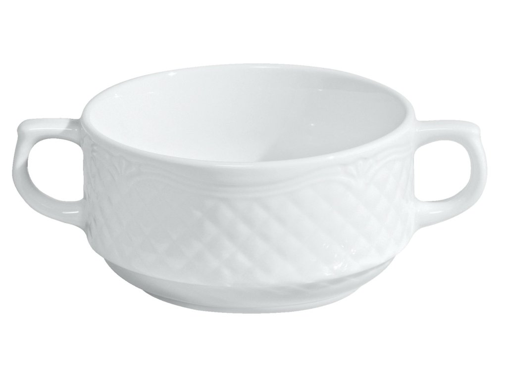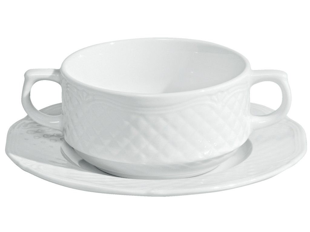 Biela porcelánová šálka na polievku s klasickým, elegantným reliéfom. Vhodná do umývačky riadu a mikrovlnnej rúry.Dodatočné parametre