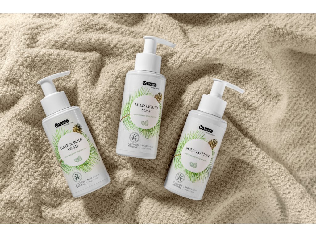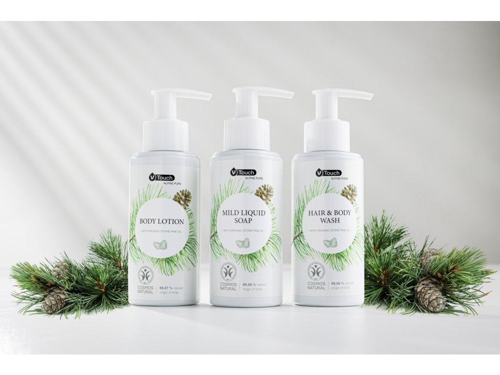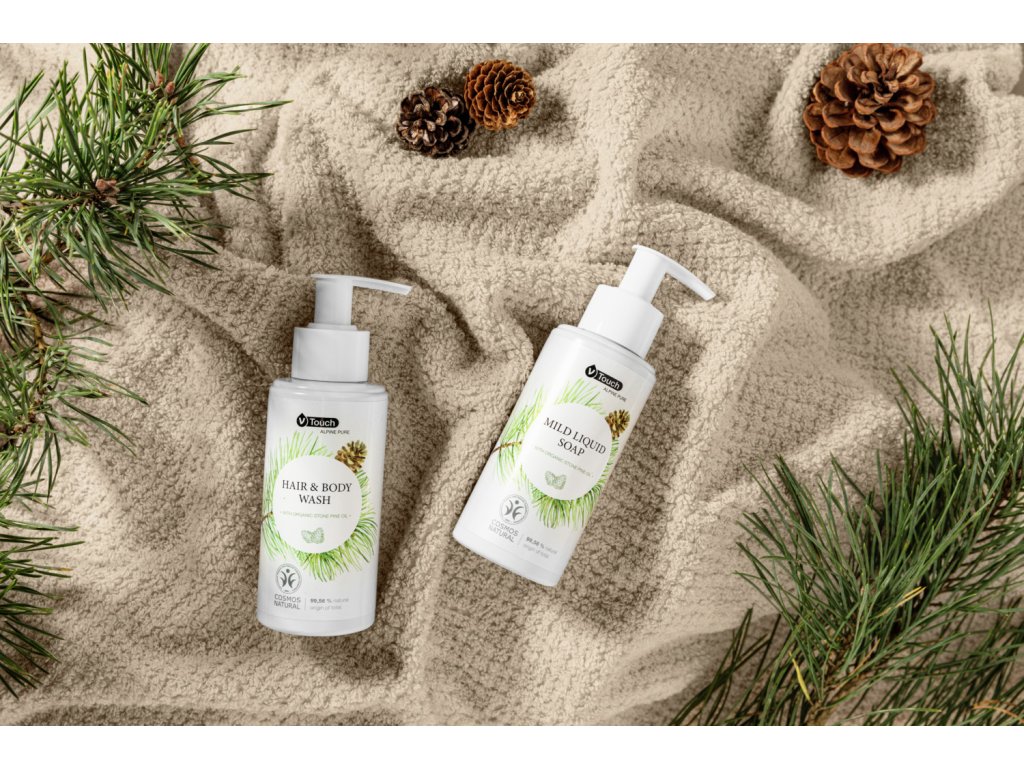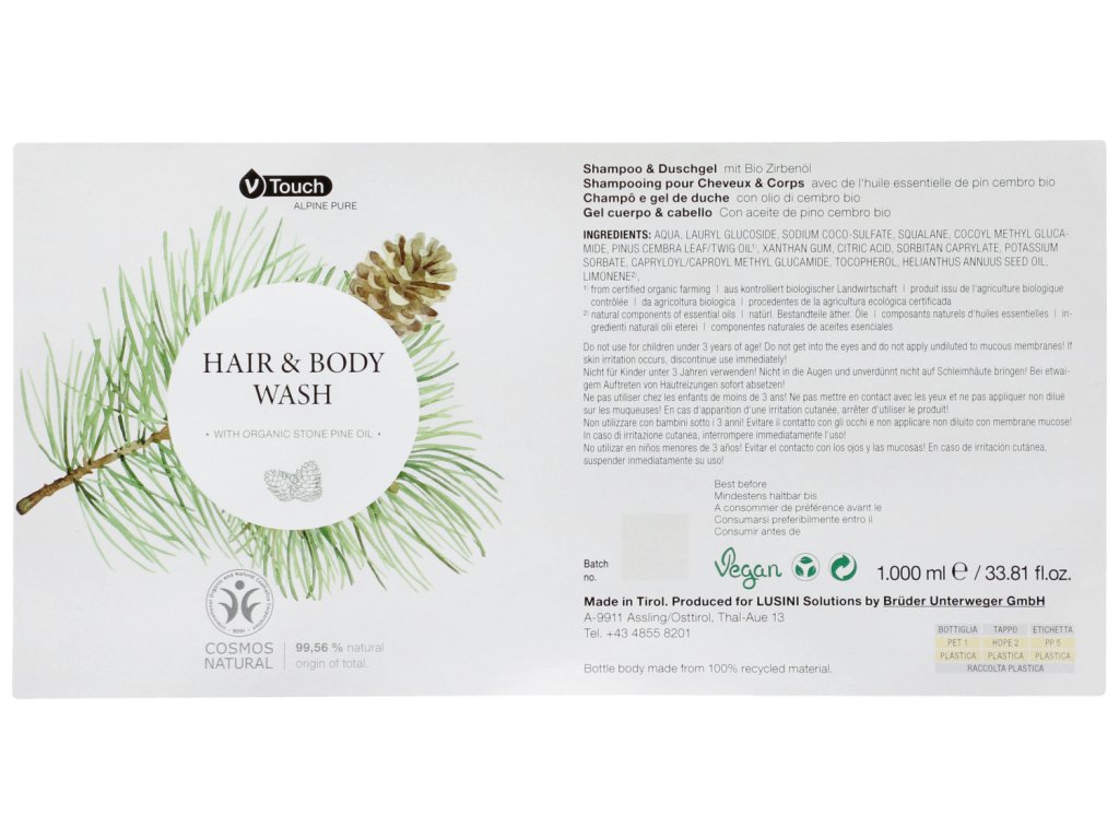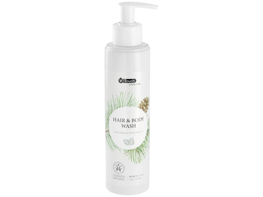 Harmonizujúca, certifikovaná prírodná kozmetika V-Touch Alpine Pure starostlivosť o vlasy a telo v jednom. Jemne čistiaci gél na vlasy a telo je vhodný pre všetky typy vlasov a pokožky. So zaručeným pravým švajčiarskym organickým olejom z kamennej borovice z certifikovaného ekologického poľnohospodárstva. Korenisto-trpká vôňa švajčiarskej kamennej borovice zaisťuje dlhotrvajúci relaxačný zážitok zo starostlivosti. Upokojujúce vlastnosti poskytujú jemnú starostlivosť o pokožku a vlasy a zanechávajú pocit sviežosti a čistoty. Dermatologicky testované a pH neutrálne! Dávkovač s pumpičkou je vyrobený zo 100 % recyklovaného materiálu a je možné ho opätovne naplniť, objednajte si fľaštičku s náplňou teraz. Obsah: 140 ml alebo 240 ml dávkovač s pumpičkou.Dodatočné parametre