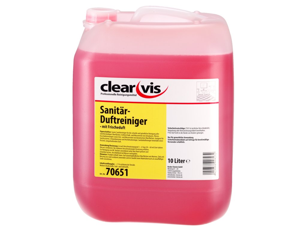 Sanitárny čistiaci prostriedok na rýchle a dôkladné čistenie všetkých povrchov odolných voči kyselinám. Odstraňuje vodný kameň a zvyšky vody z vodovodných batérií, obkladačiek, sprchových kútov a močový a vodný kameň z keramických povrchov. Pri použití v koncentrovanej forme účinné látky zabezpečujú hygienicky dokonalé povrchy. Vhodný pre rozprašovacie systémy, penové kanóny a vysokotlakové čističe. Zanecháva sviežu, dlhotrvajúcu vôňu. Použitie / dávkovanie: Pri silnom znečistení naneste neriedený a nechajte pôsobiť päť minút. Potom opláchnite vodou. Na udržiavacie čistenie zrieďte 0,5 - 1 % (40 - 80 ml/8 litrov studenej vody). Poznámky: Prípravok obsahuje kyselinu. Na povrchy citlivé na kyseliny, ako je mramor, zinok a mosadz, používajte len vysoko zriedený výrobok a v prípade pochybností vykonajte skúšku materiálu na nenápadnej ploche. Pokyny na skladovanie: Chráňte pred mrazom. Pri správnom skladovaní je doba použiteľnosti 2 roky. Výstražné upozornenia: * H314 Spôsobuje vážne popáleniny pokožky a poškodenie očíDodatočné parametre