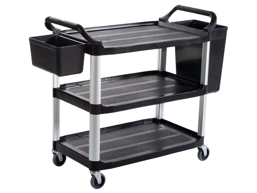 Robustný servírovací vozík z plastu (polypropylén) s tromi policami, štyrmi otočnými kolieskami a veľmi tichým a plynulým chodom. Vysoká stabilita a nosnosť vďaka zosilnenej základnej konštrukcii a nosným tyčiam z eloxovaného hliníka. Nosnosť max. 300 kg s rovnomerným rozložením na tri police, vzdialenosť medzi základňami 30 cm. Zásuvný systém - dodáva sa v demontovanom stave. Možno zostaviť len pomocou dodanej gumovej paličky. Zberné koše SKU 30000895 a SKU 30000896 sú k dispozícii samostatne.Dodatočné parametre