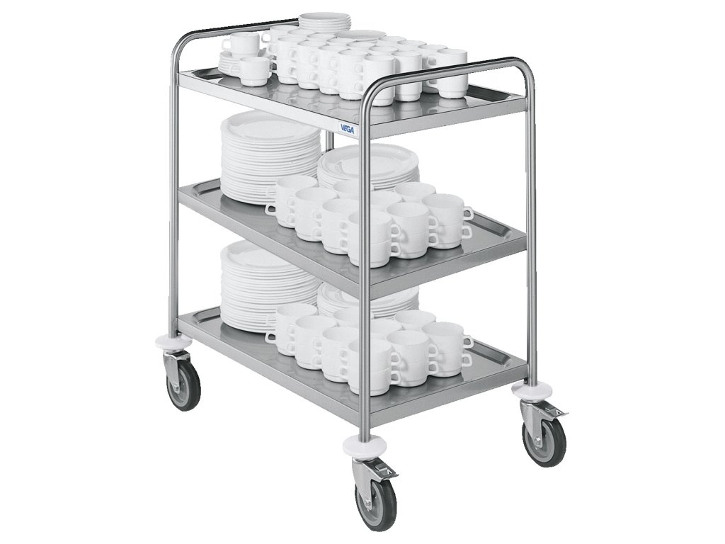 Servírovací vozík vyrobený z nehrdzavejúcej chrómniklovej ocele 18/10. Na jednoduchú prepravu riadu, potravín a iných predmetov. Robustná okrúhla rúrka s priemerom 2,5 cm. Police vybavené protihlukovými podložkami proti bubnovaniu. Nosnosť na jednu policu: 80 kg. K dispozícii s dvoma alebo tromi policami. Štyri kolieska chránené proti korózii, dve s aretáciou. Jednoduchá manipulácia a údržba. Nádoby na odpad a príbory sú k dispozícii samostatne. Dodáva sa zmontovaný, vozík je pripravený na okamžité použitie.Dodatočné parametre
