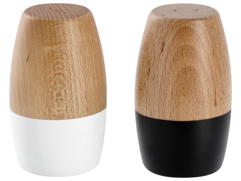 Set soľničky a koreničky je zhotovený z bukového dreva, soľnička je čiastočne lakovaná bielou a korenička čiernou farbou. Materiál: drevo.Dodatočné parametre