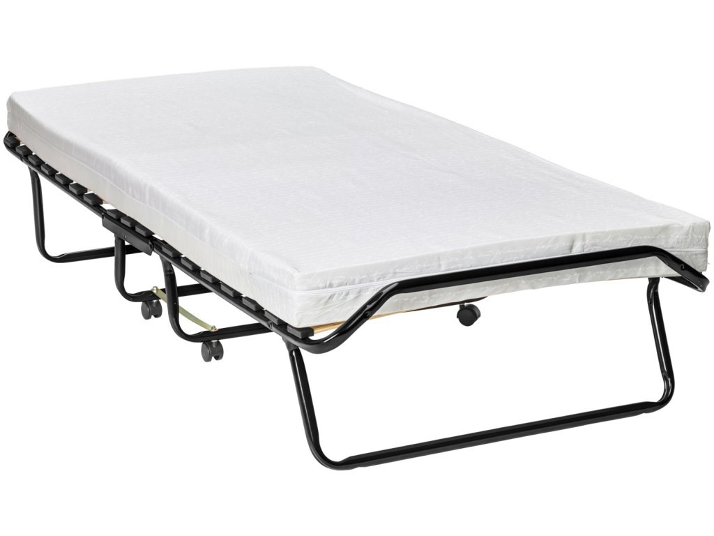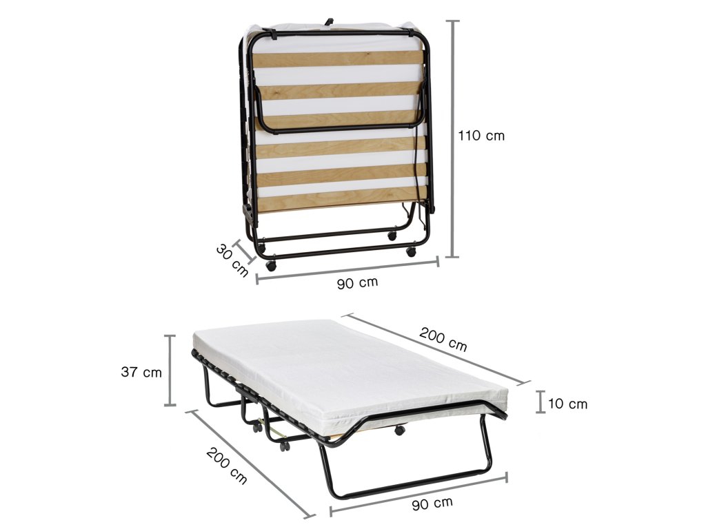 Skladacia posteľ s integrovaným lamelovým roštom a penovým matracom. Robustný rám. Lamelový rám so 17 drevenými lamelami. Penový matrac s výškou 10 cm a hustotou 24/m³. Poťah matraca zo 100 % polyesteru s protipožiarnou úpravou. Rýchla a jednoduchá manipulácia, posteľ sa dá zložiť a uložiť, čím sa šetrí miesto. Jednoduchá preprava: po zložení sa posteľ dá naviezť na kolieska. Rozmery v zloženom stave: 90x110x30 cm (ŠxVxH).Dodatočné parametre