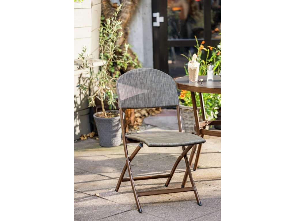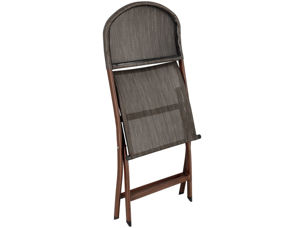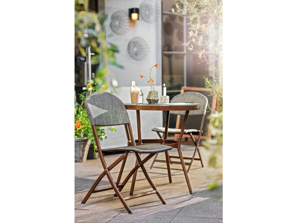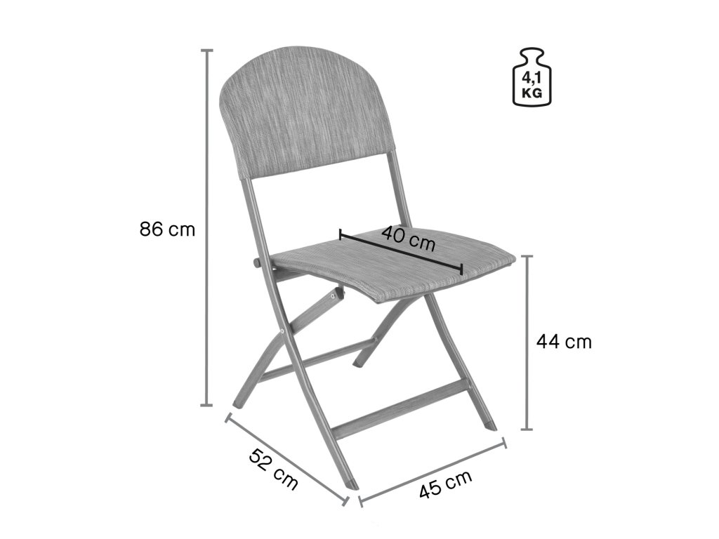 Moderná skladacia stolička z ocele s práškovou povrchovou úpravou a sedadlo s plastovou textíliou. S plastovými klzákmi na nohách stoličky. Skladacia, odolná voči poveternostným vplyvom a UV žiareniu. Rozmery v zloženom stave: 45x14x100 cm (ŠxHxV). Vhodné na vonkajšie použitie. Dodáva sa v zmontovanom stave. Objednajte si zároveň zodpovedajúce stoličky z tejto série alebo stôl.Dodatočné parametre