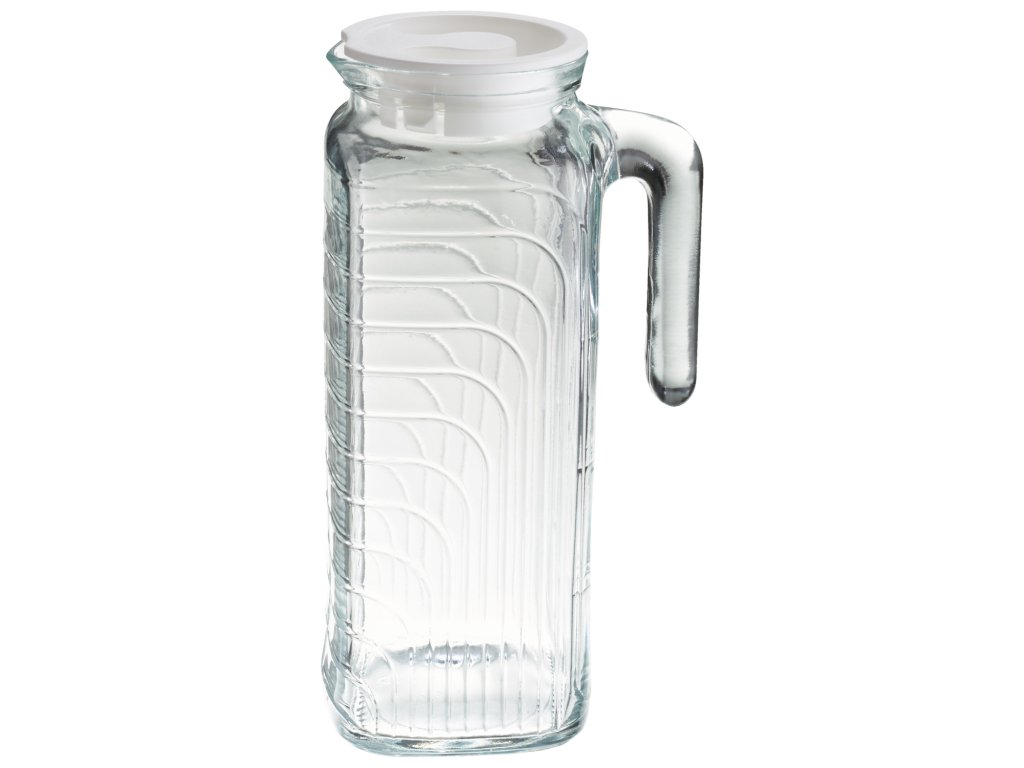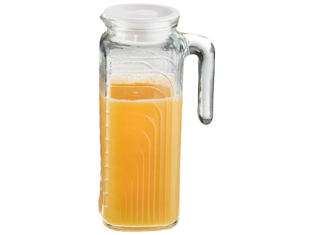 Hranatý sklenený džbán s plastovým vrchnákom. Vhodný do dverí chladničky. S rukoväťou a výlevkou. Sklenený džbán je vhodný do umývačky riadu, plastový vrchnák nie.Dodatočné parametre