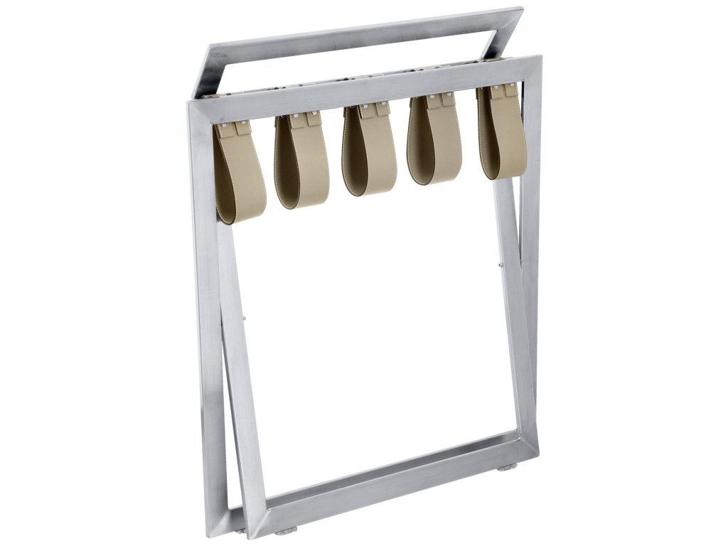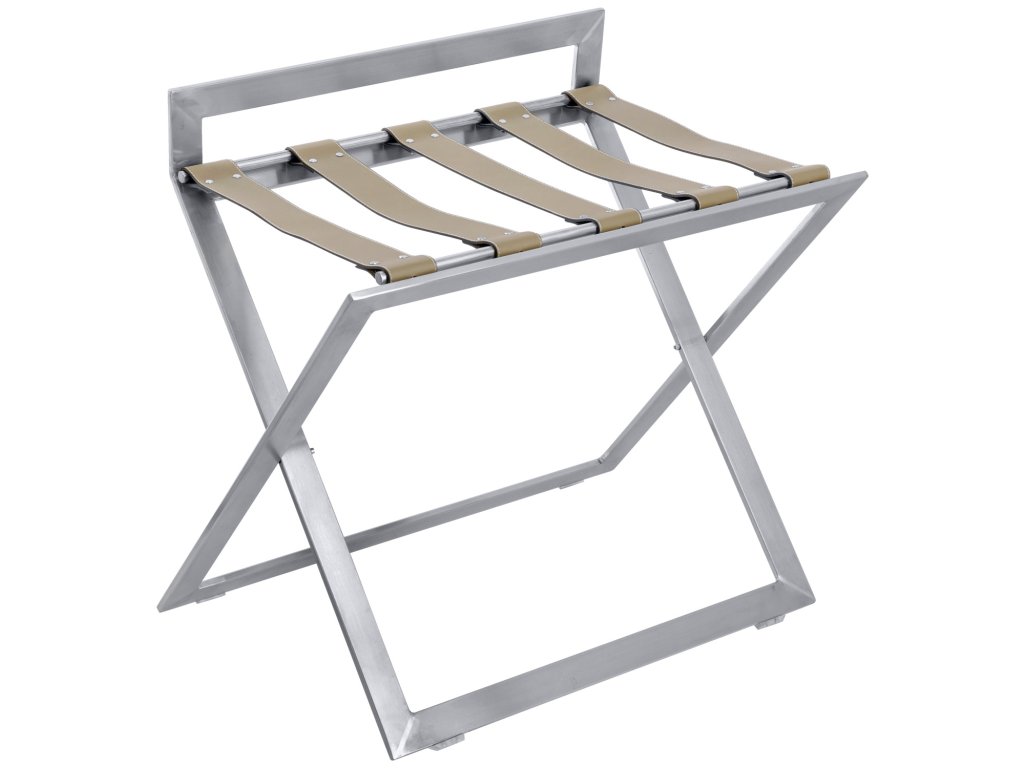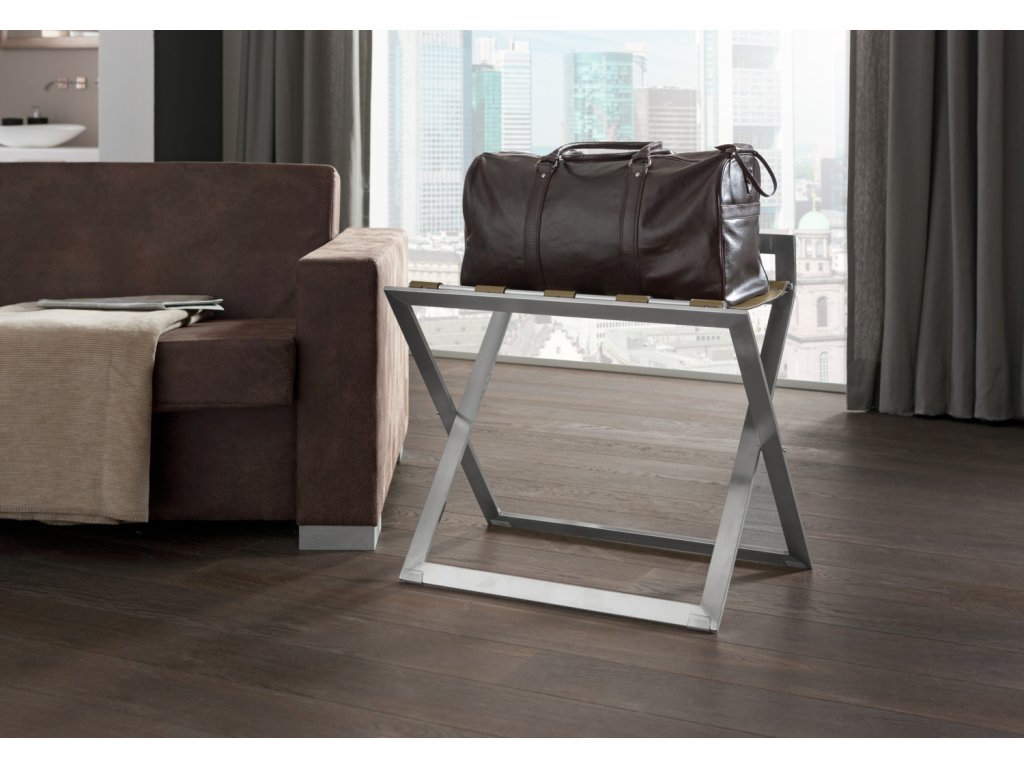 Skladací stojan na kufre je vyrobený z nehrdzavejúcej ocele a nitovaných remienkov z imitácie kože. Stojan na kufre sa ľahko ovláda a je mimoriadne funkčný. Rozmery poličky: ŠxD 43x60 cm. Unesie až 50 kg. S integrovanou ochrannou lištou na stenu a podlahovými klzákmi.Dodatočné parametre