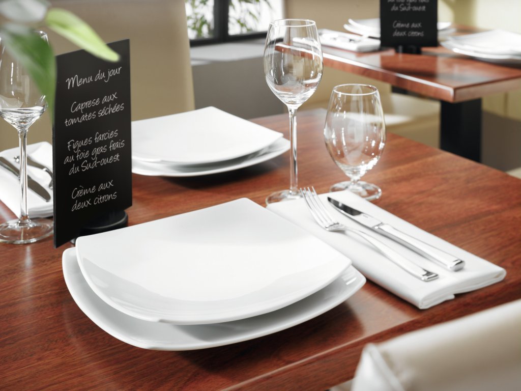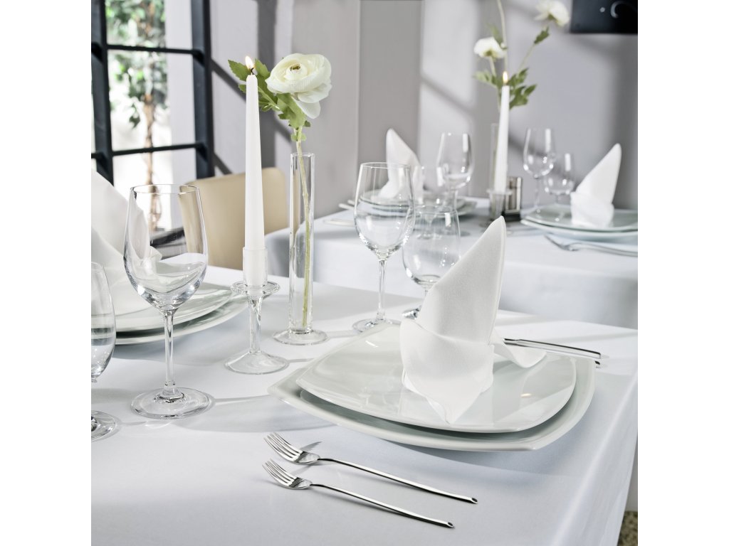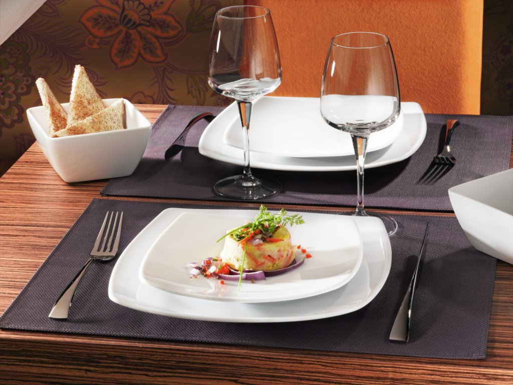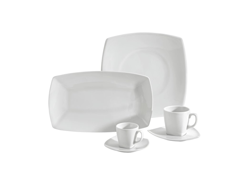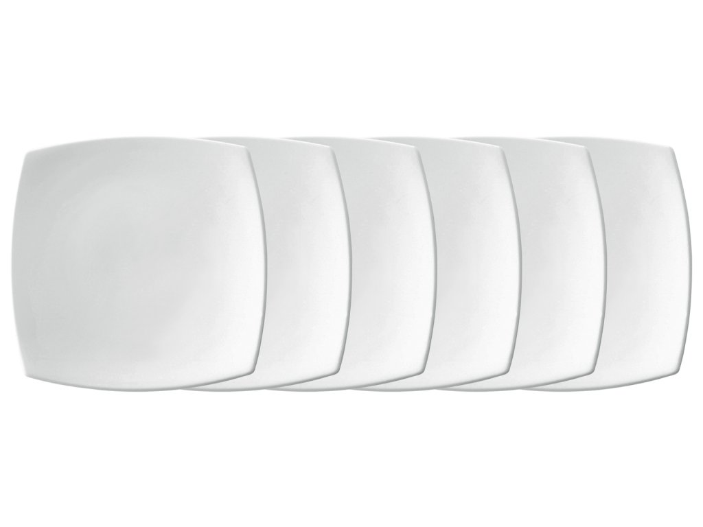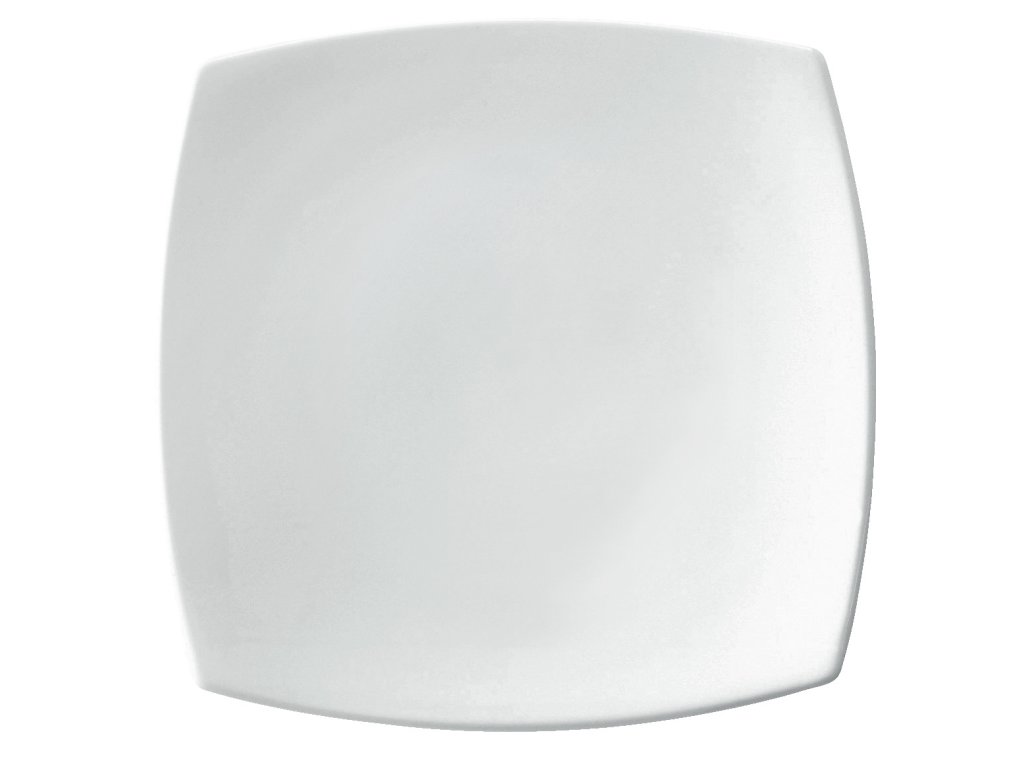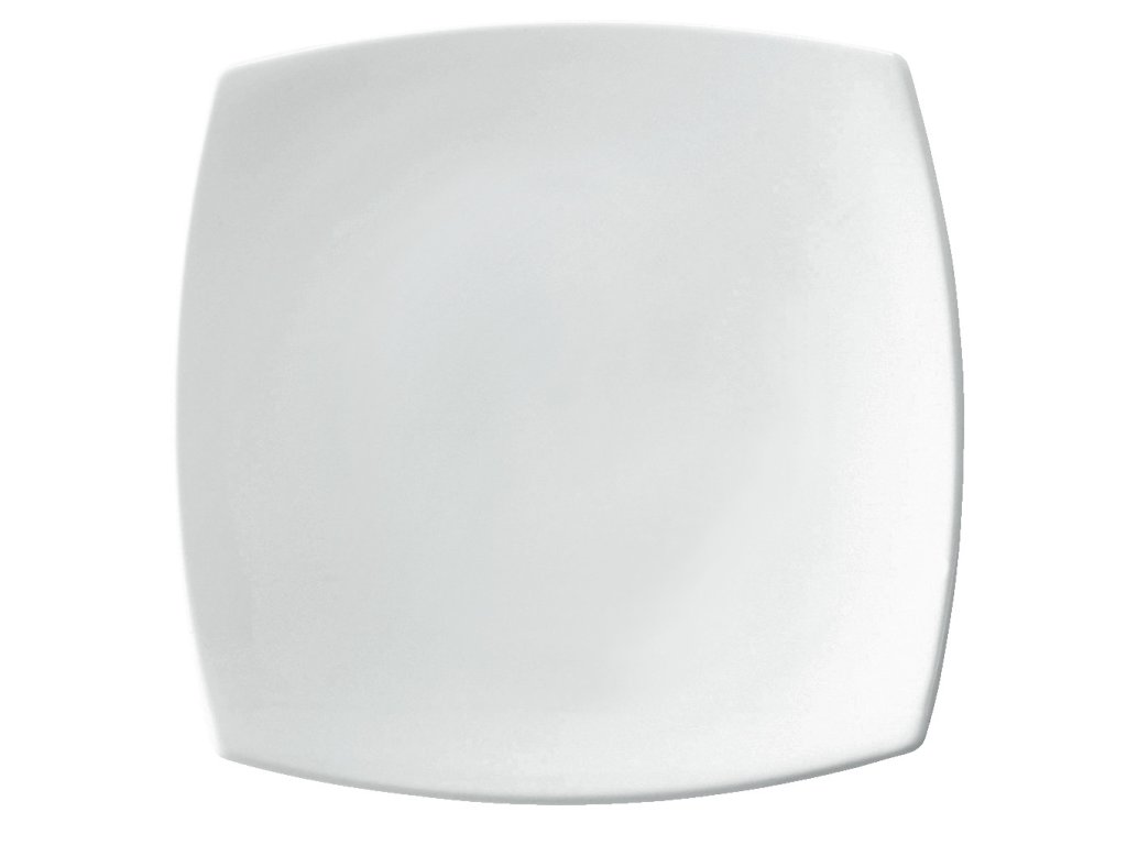 Biely porcelánový tanier štvorcového tvaru. Bez okraja. Vhodný do umývačky riadu a mikrovlnnej rúry.Dodatočné parametre