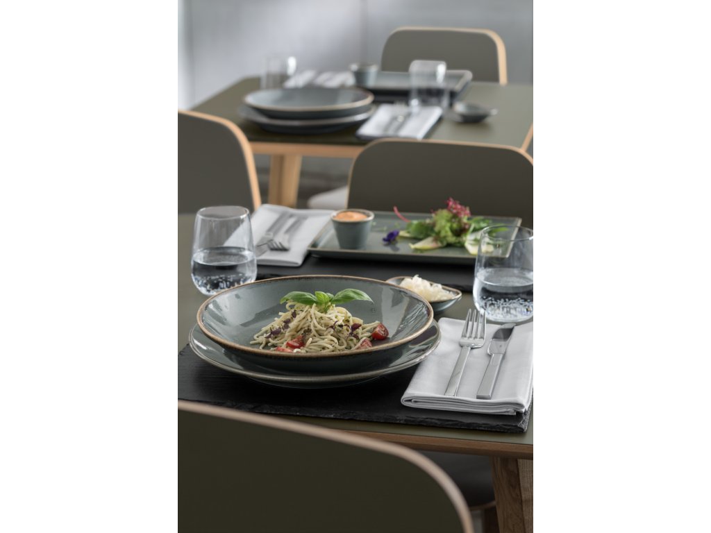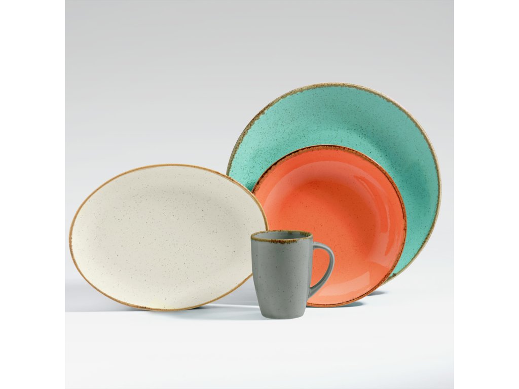 Farebný porcelánový tanier s keramickým vzhľadom. Bez okraja. S mierne nepravidelnými okrajmi v glazúre. Vhodný do umývačky riadu a mikrovlnnej rúry.Dodatočné parametre