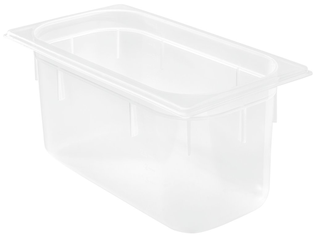 Obdĺžniková plastová nádoba GN 1/3 vyrobená z polypropylénu bezpečného pre styl s potravinami. Odolná voči nárazom a veľmi robustná. Priehľadná, vďaka čomu je obsah zvonku ľahko rozpoznateľný. Univerzálne použitie pri teplotách od -40 °C do +95 °C. Označenie náplne na vonkajšej strane. Plniaci objem 9,8 litra. Dodáva sa bez veka a odkvapkávacej misky a bez bisfenolu A. Vhodné do umývačky riadu.Dodatočné parametre