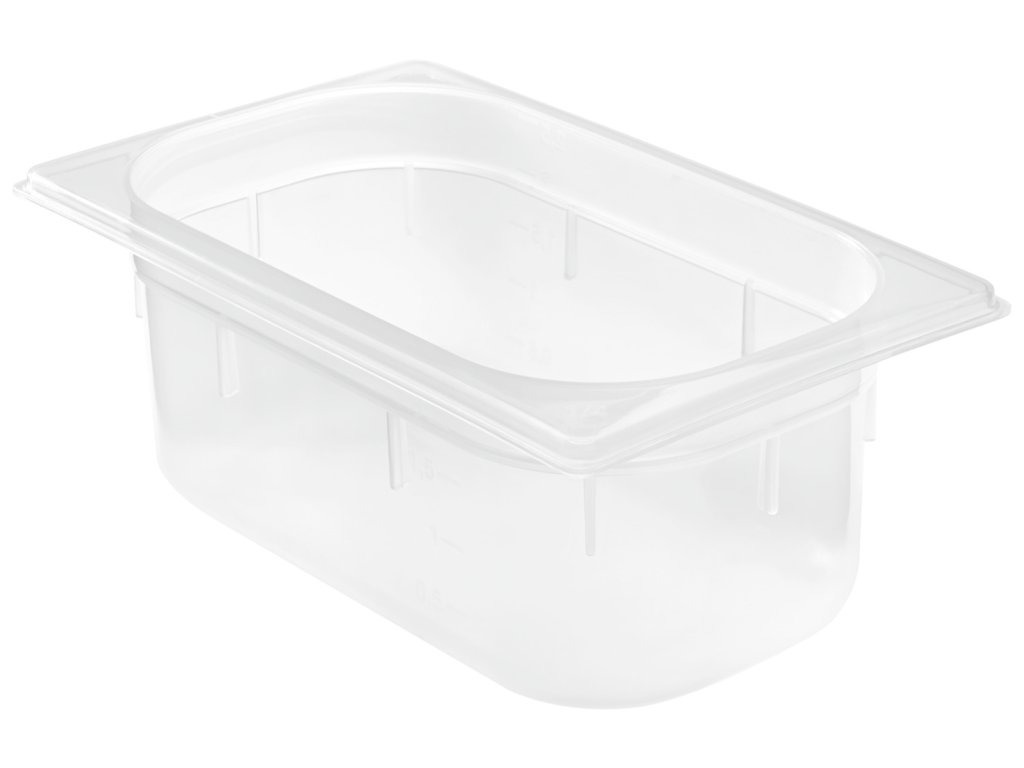 Obdĺžniková plastová nádoba GN 1/4 z polypropylénu, ktorý je vhodný na použitie v potravinárstve. Odolná voči nárazom a veľmi robustná. Priehľadná, vďaka čomu je obsah zvonku ľahko rozpoznateľný. Univerzálne použitie pri teplotách od -40 °C do +95 °C. Označenie náplne na vonkajšej strane. Plniaci objem 9,8 litra. Dodáva sa bez veka a odkvapkávacej misky a bez bisfenolu A. Vhodné do umývačky riadu.Dodatočné parametre