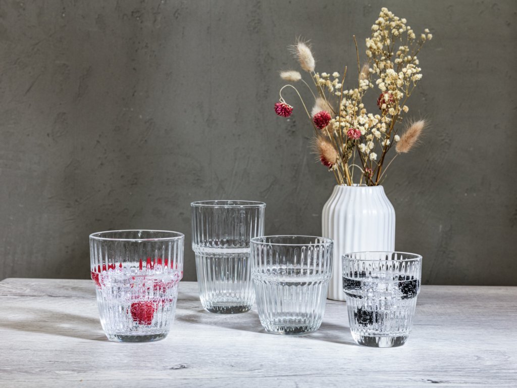 Univerzálny pohár z tvrdeného skla s jemnou štruktúrou na vnútornej strane. Možno ho stohovať a umývať v umývačke riadu.Dodatočné parametre