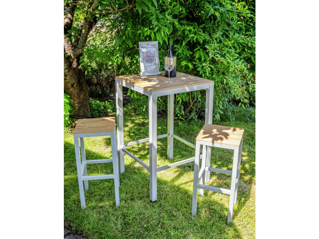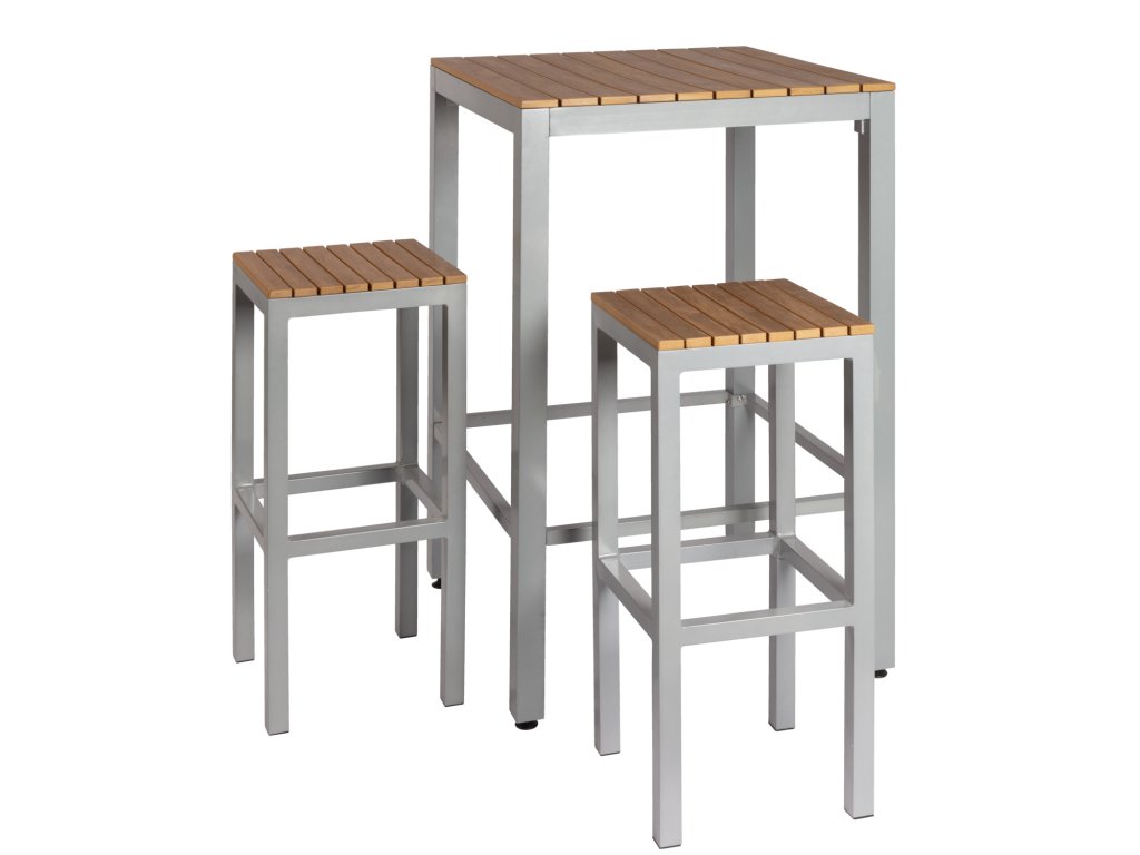 Táto barová súprava Resistance odolná voči poveternostným vplyvom, ktorá sa skladá z 2 barových stoličiek Resistance a zodpovedajúceho barového stola Resistance, je ideálna na vonkajšie použitie a pozýva vás stráviť hodiny oddychu vonku. Vonkajšie stoličky a stôl sú vyrobené z ľahkého práškovo lakovaného hliníka (hrúbka materiálu 1,5 cm). Sedadlo a doska stola sú vyrobené z 1,5 cm hrubých plastových lamiel so vzhľadom teakového dreva. Stohovateľné, odolné voči poveternostným vplyvom a UV žiareniu. S plastovými podlahovými klzákmi. Vysoký stôl sa dodáva v demontovanom stave, upevňovací materiál je súčasťou dodávky. Poznámka: Vonkajšie stoly s plastovými lamelami vo vzhľade dreva majú oproti stolom s drevenými doskami mnoho výhod. Pri používaní týchto stolov však treba mať na pamäti niekoľko bodov: Sklenené poháre alebo iné sklenené predmety, ako sú popolníky alebo vázy, môžu na priamom slnku spôsobiť efekt horiaceho skla (efekt lupy), čo môže poškodiť povrch.Dodatočné parametre